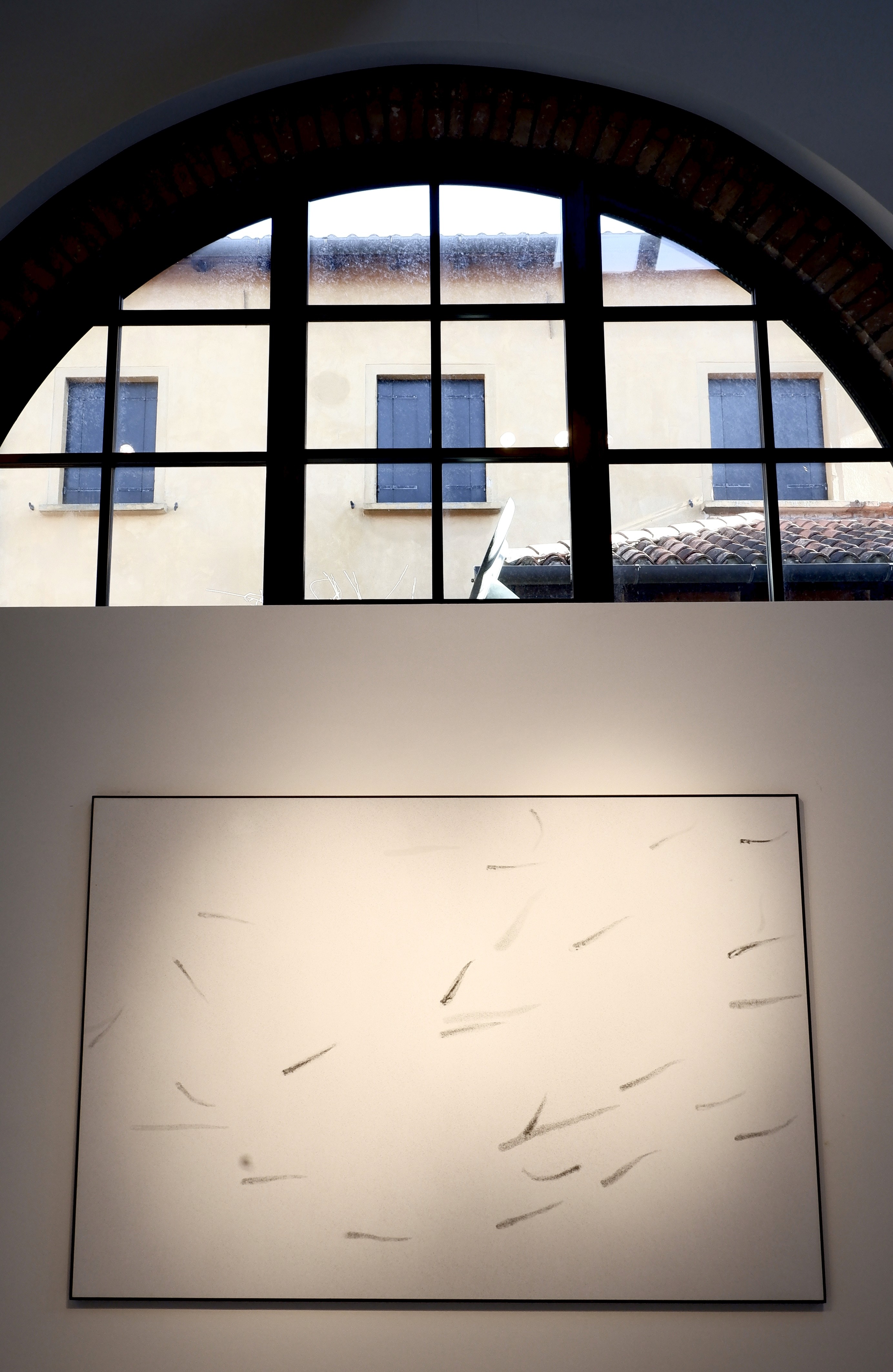 Each photograph, isolated in the white space, clearly shows Venice as it is: islanded. One of the most conspicuous images selected by Wilmotte (though initially opposed by D’Agostin) is the pond with fish. Vague strokes of grey are punctuated with the spines of fish, making them look like microbes under a microscope.