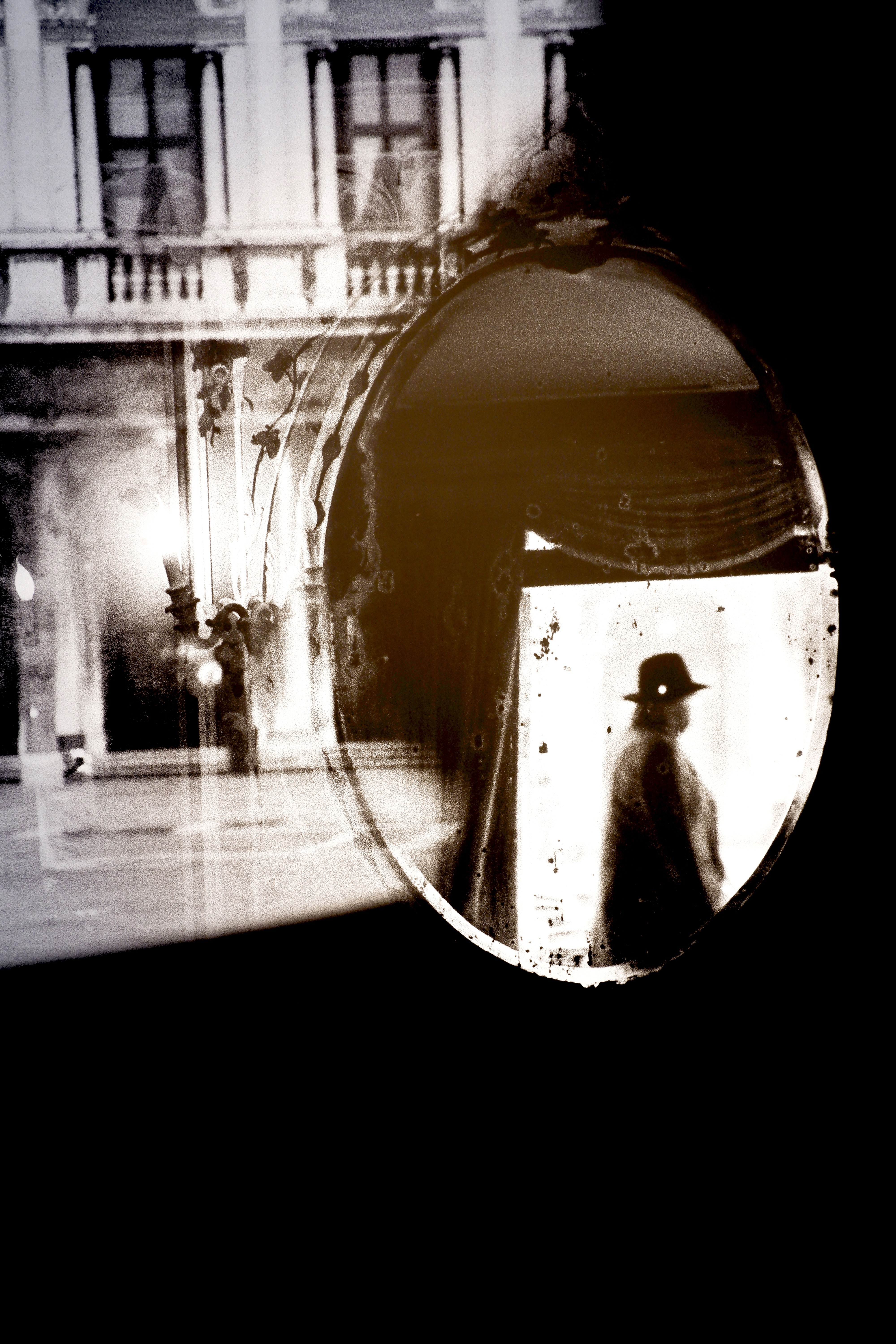 The eight images demand the same meditative approach as the city itself. Each photograph isolates a fragment of Venice, recreating it through warped memory: a small portion of the postcard city, a figure trapped in a mirror, or swallowed by inky blackness.